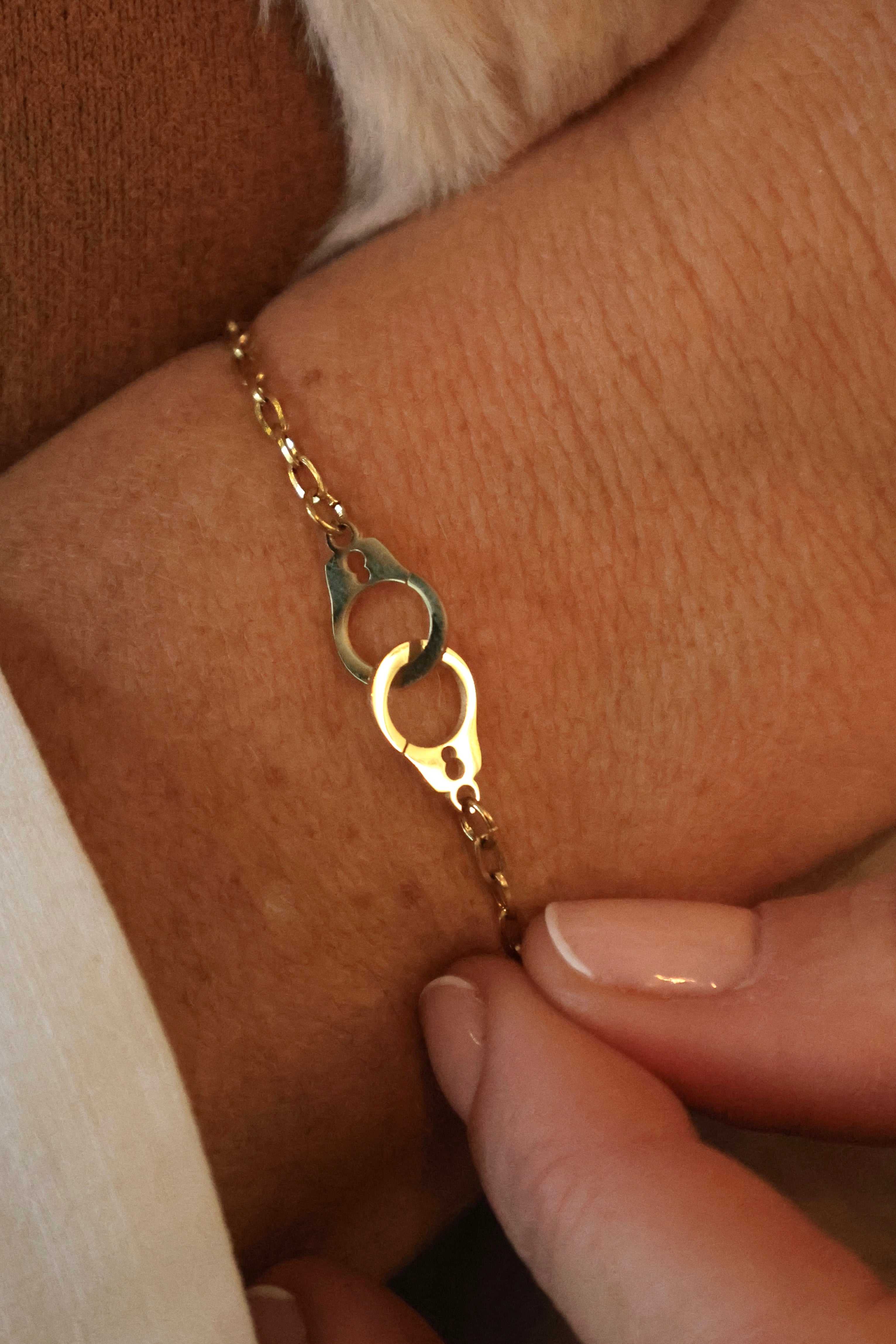 Un bracelet délicat et symbolique, composé d’une chaîne fine dorée et d’un fermoir menottes iconique.
