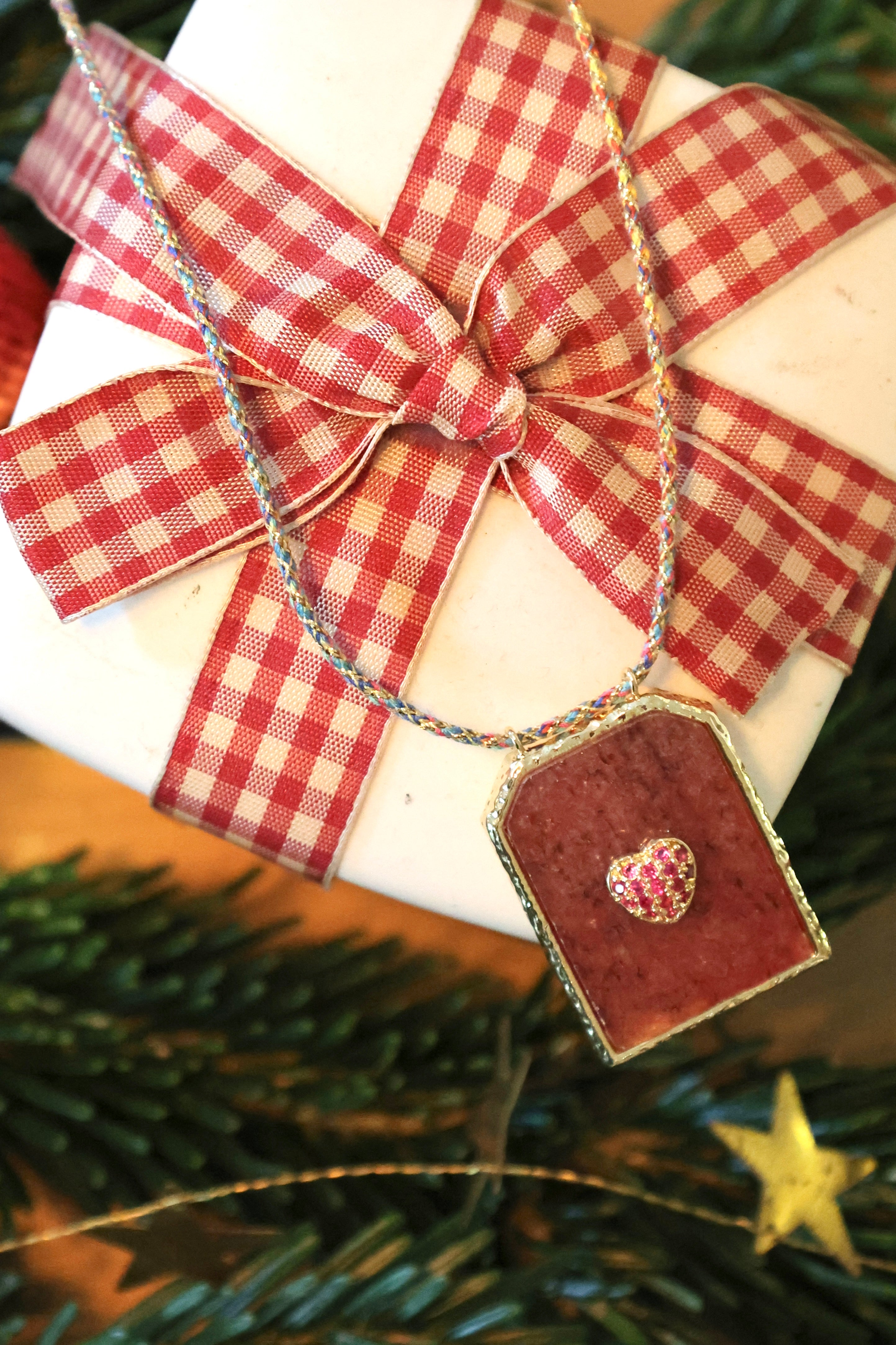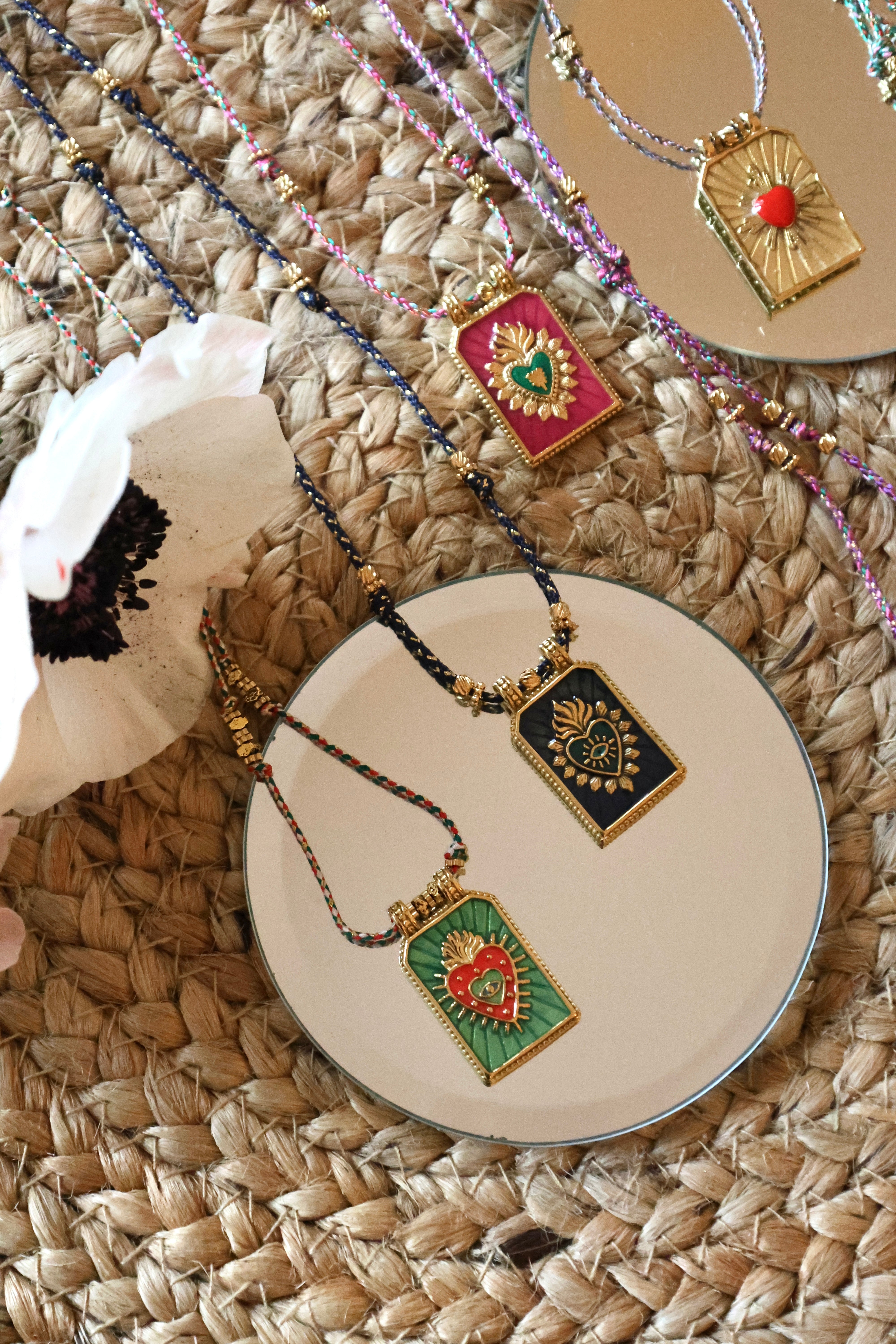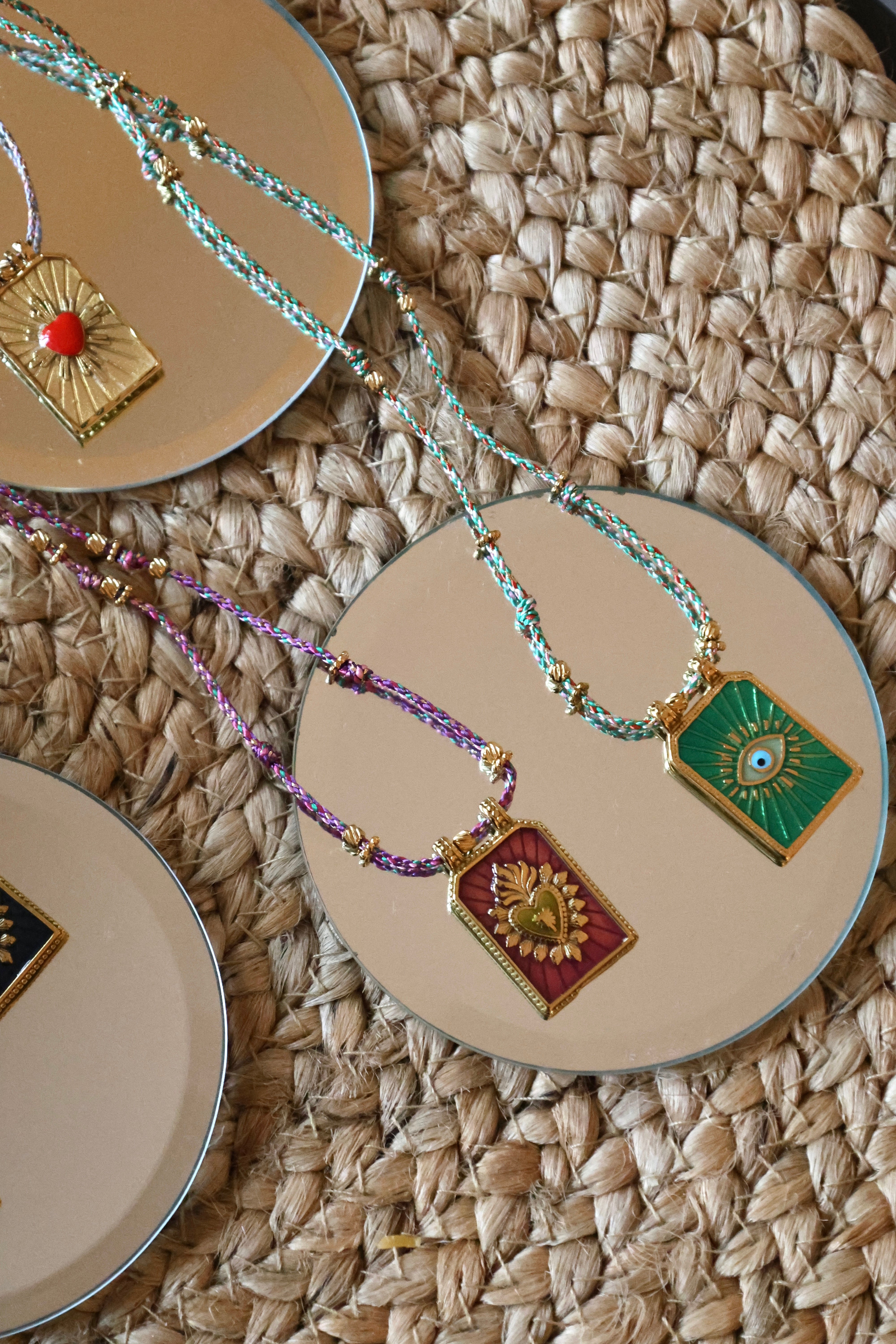 La médaille émaillée est montée sur un cordon tressé à la main, ponctué de perles dorées, pour un rendu chic, bohème et lumineux.