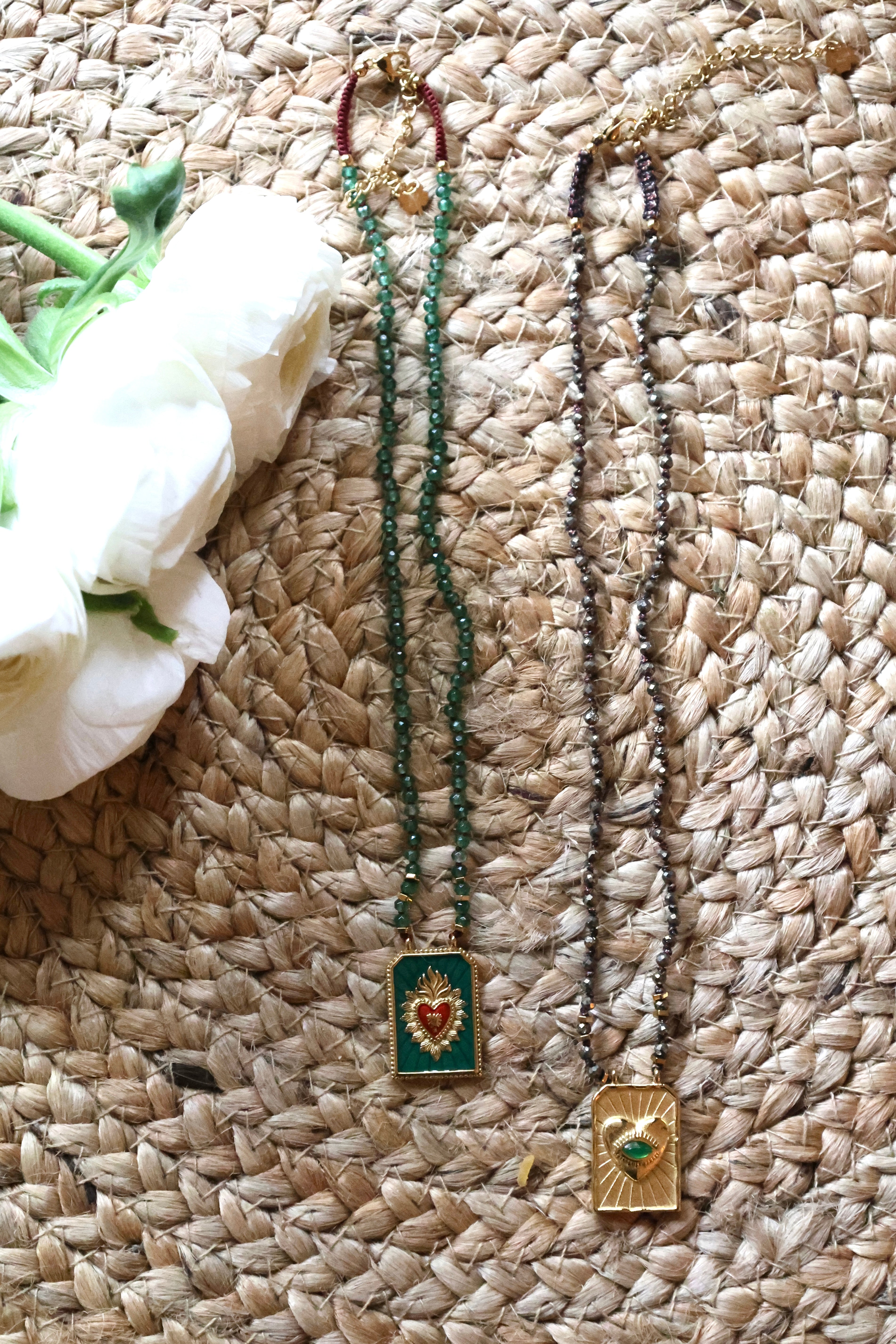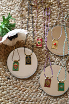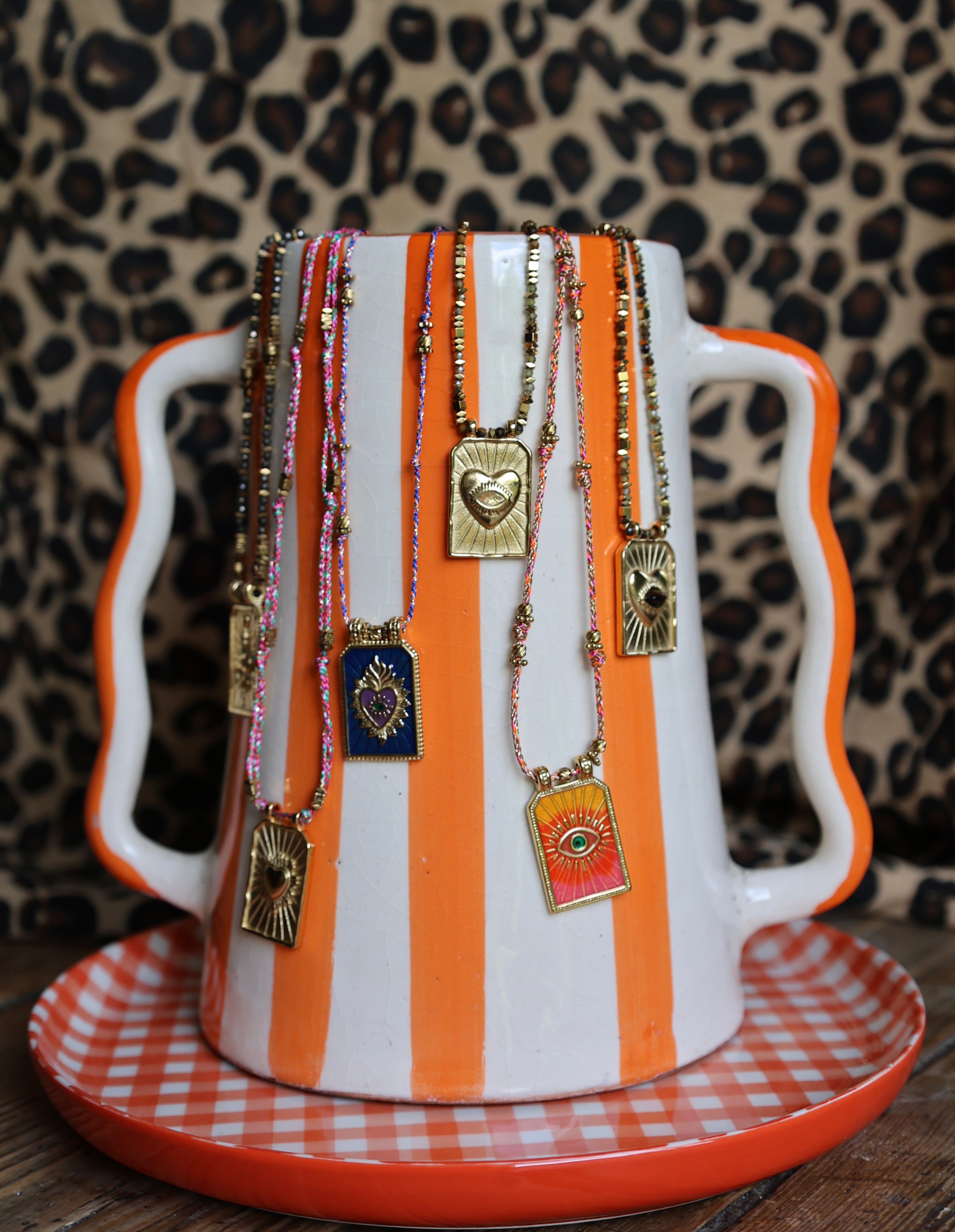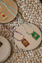 Le collier Sacré est une pièce forte, inspirée des icônes sacrées revisitées en version colorée et lumineuse. Chaque médaille a son symbole — cœur ardent, œil protecteur, soleil ou flamme — pensée comme un porte-bonheur à porter au quotidien.